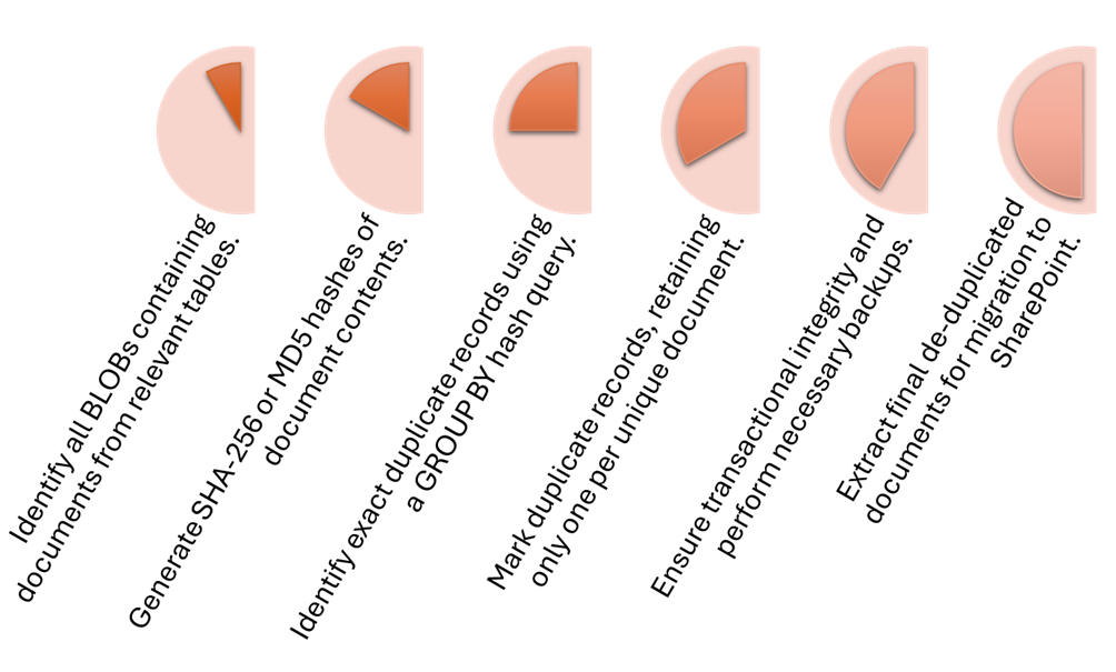 In this post, we explore a real-world data migration challenge encountered during a client's transition from an on-premises CRM to a cloud-based solution. A critical issue was the presence of nearly 1TB of documents, far exceeding the expected volume due to widespread duplication. To address this, we implemented an in-situ de-duplication strategy using Oracle SQL. This approach allowed us to identify exact duplicates within the database, mark them efficiently, and prepare the data for migration to SharePoint. Although we briefly reference a Python-based near-duplicate detection solution, this post focuses exclusively on the Oracle SQL solution, with further details to be provided in a subsequent post.