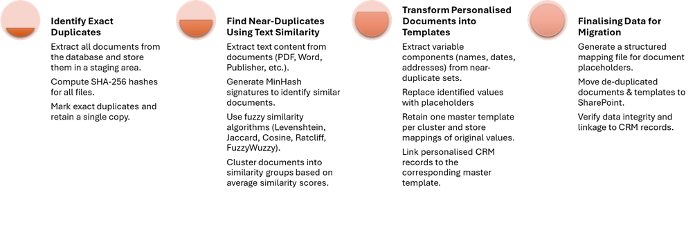 Given that the cloud-based CRM’s storage and ingress/egress costs are significantly higher than SharePoint, we advised the client to offload document storage to SharePoint, linking records in the CRM to the relevant documents. However, before migration, de-duplication was essential to avoid unnecessarily storing and managing redundant documents.