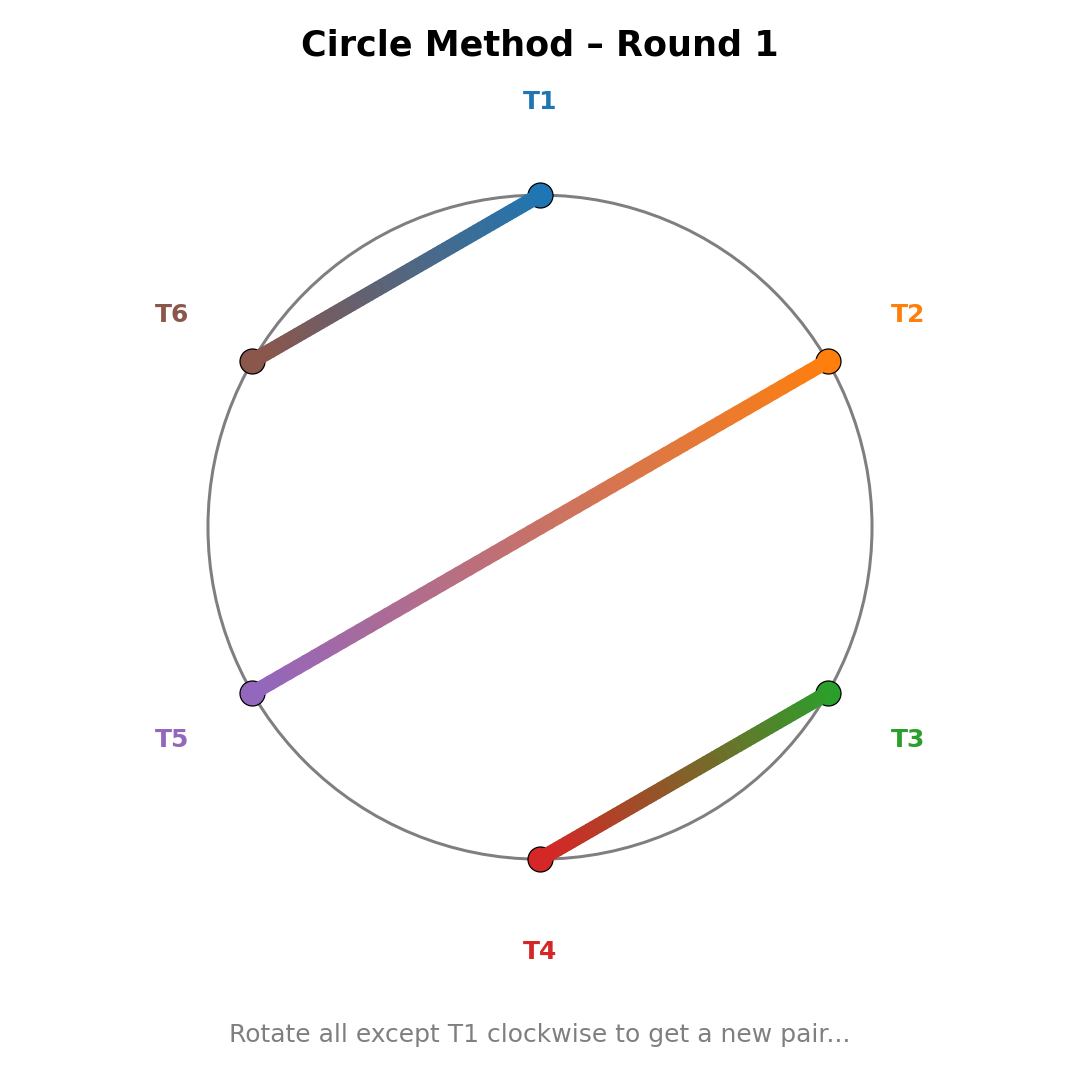 Long before computers, tournament organisers used a beautifully simple technique for round-robins: the circle method. Write all team names around a circle, fix one at the top, and rotate the rest clockwise each round. Each rotation defines a new set of pairings.